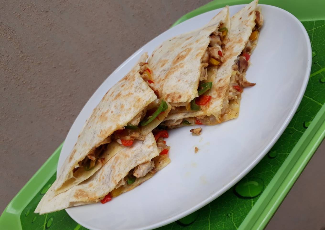 - Place a non stick pan/iron skillet on medium flame. Place the tortilla wrap on the heated pan, spread crated cheese (as desired) followed by the chicken, the peppers, another layer of cheese then cover with another tortilla wrap.