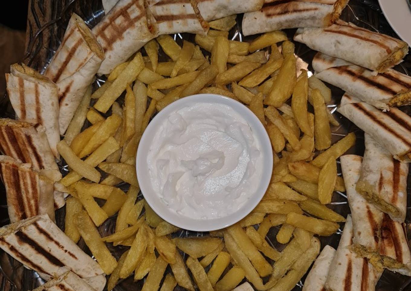 - In a large rounded tray, add the tortilla shawarma sandwiches around the tray / Add the potatoe fries to the center. You can also add a small bowl of garlic to the center too. Try it you won't regret!