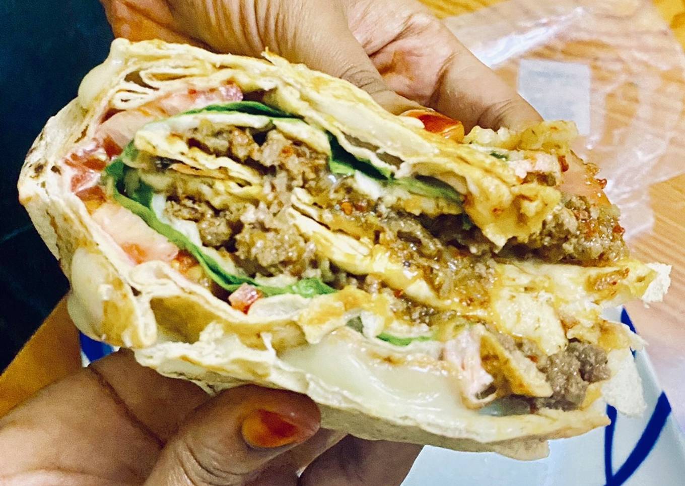 - Divide your tortilla into 4. Add minced meat sauce, cheese, veggies and the mayonnaise mix on each side as seen on the picture. I add sausages instead of minced meat to the other tortilla