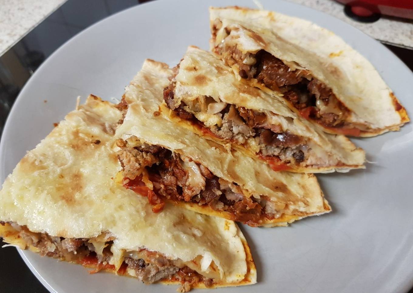 - Add a little more grated cheese to the Top and just grill it for a minute just until the cheese has melted and browned. Leave to cool and cut into 4 Quaters and serve for Breakfast or Lunch.and you have 4 Quesadillas.