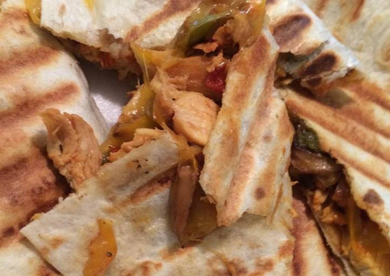 - Mix chicken, bell peppers and onion mix until desired amounts. layer mix on a whole tortilla, cheese and place another tortilla on top.