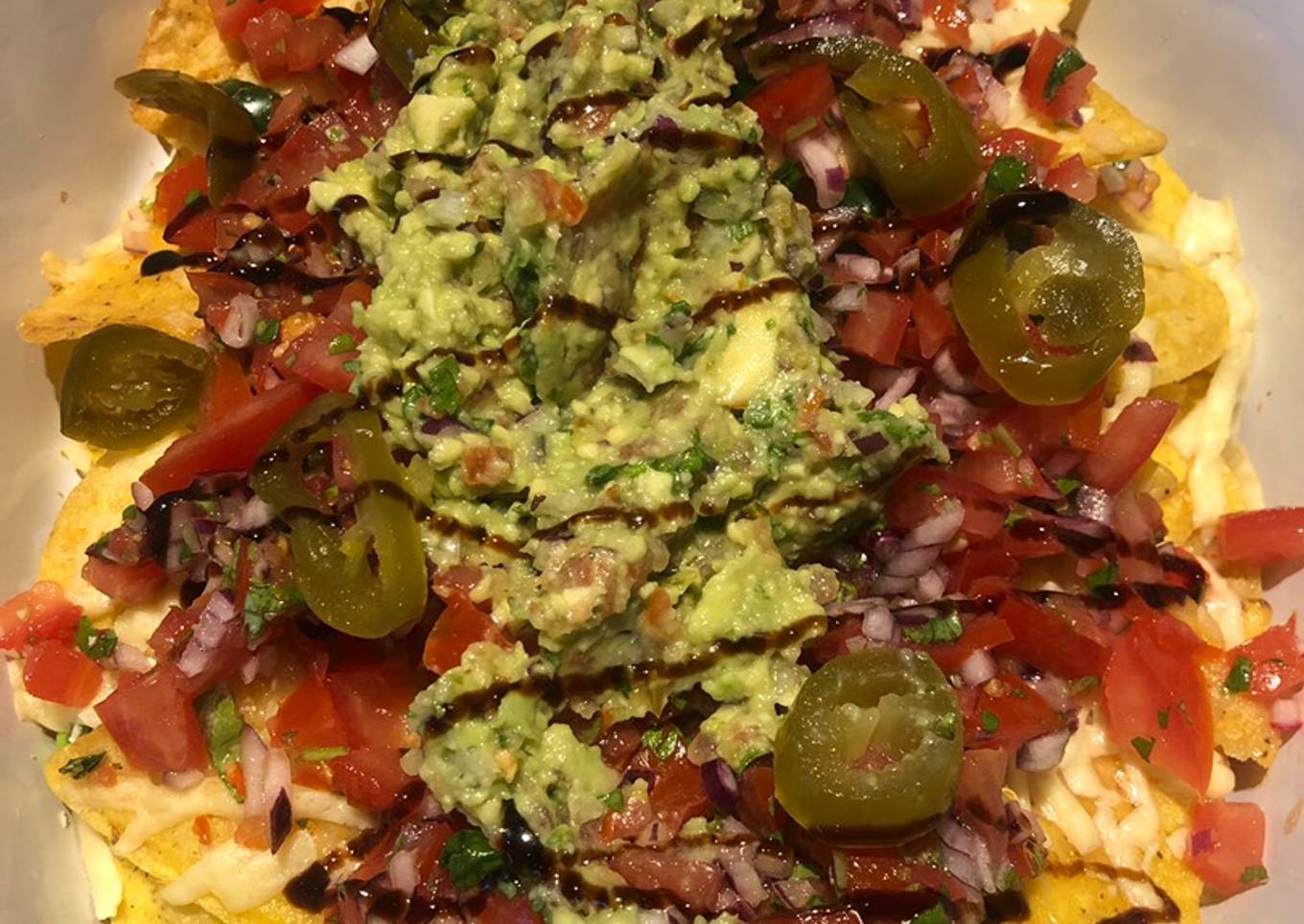 - Add the sales, then guacamole, then jalapeños to the cheesy tortillas. Dress with a drizzle of balsamic glaze.