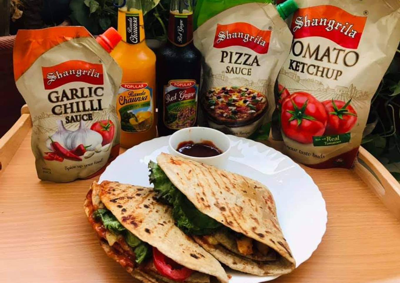 - On the roti add ketchup, salad leaves, tomatoes, cheese and the chicken sauce, following the pictures.