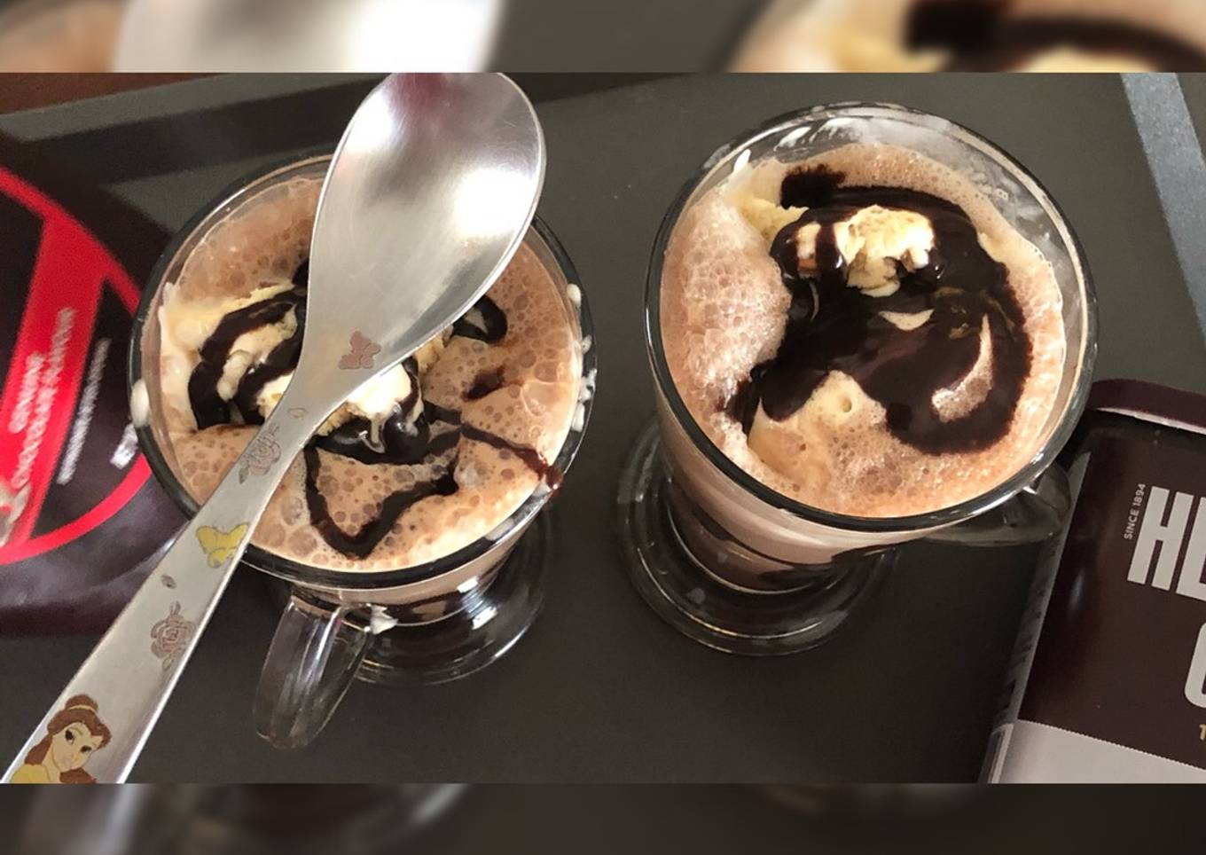 - In a glass put Hershey chocolate syrup and swirl it. Now pour prepared coffee in it. Put some ice cream on top of it. Sprinkle a pinch of cocoa powder and coffee powder on it. Drizzle Hershey’s syrup on top of it. Cold coffee is ready. Enjoy!