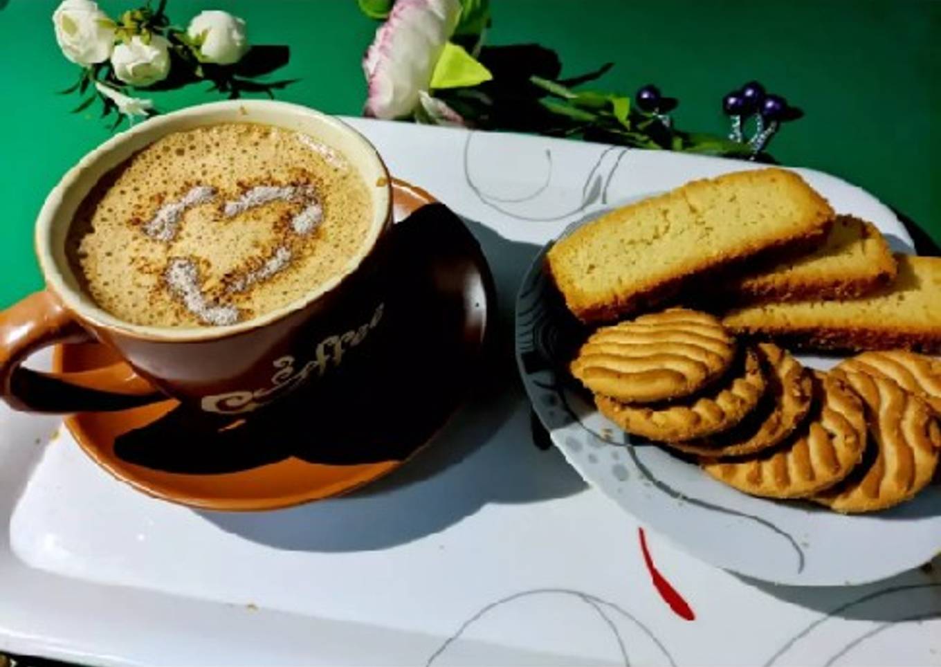 - SERVE...coffee ke uoper thora coffee powder dal dain and biscuits and cake rusk ke sath serve karain.