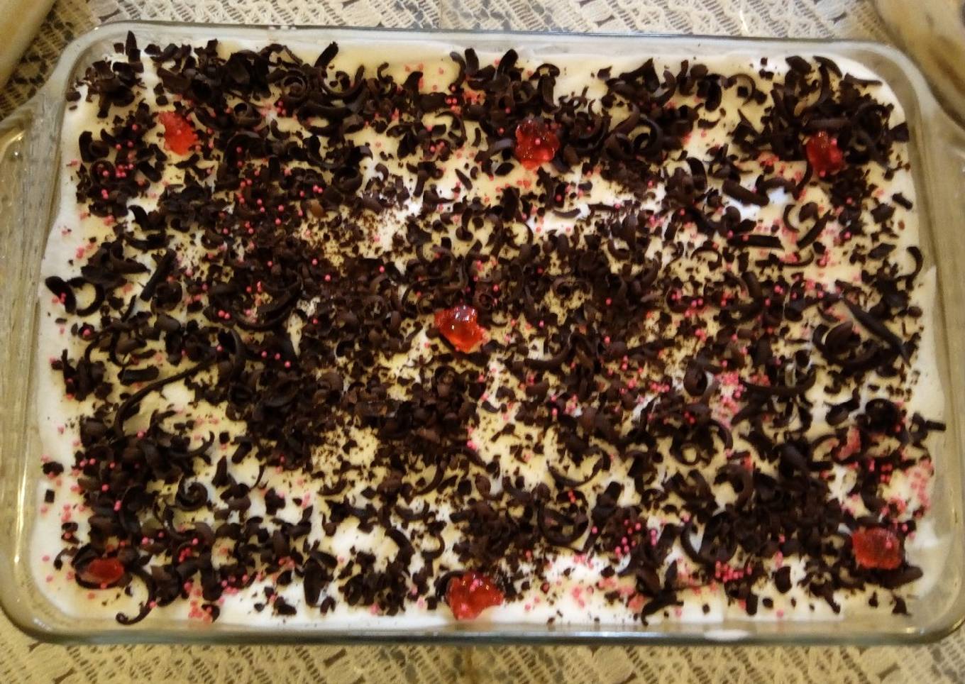- Continue till you reach the top. Pour cream, level it. Sprinkle the chocolate.