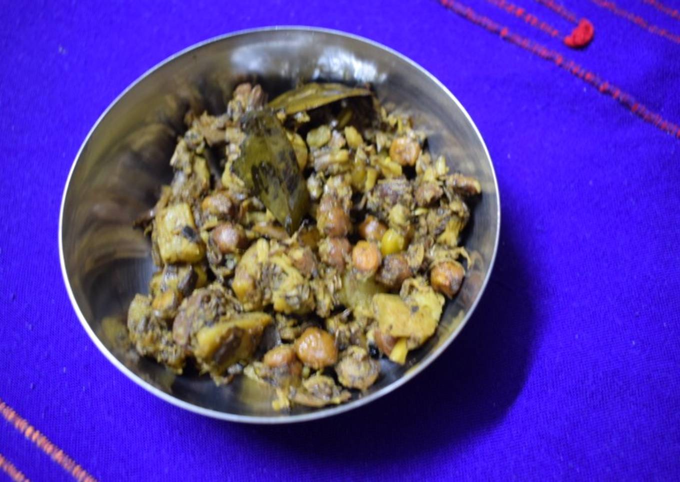 - In a bowl take ½ cup water and add the cumin, coriander and red chilli powder. Mix well. Add it to the potatoes along with the tomato paste. Mix well and cook on a low flame. If required ¼ cup of water can be added. Now drain the boiled mocha and add it to the potatoes. Add salt and sugar to taste and mix everything well. The curry is dry, so you should wait for it to come together and continue to cook on a low flame.