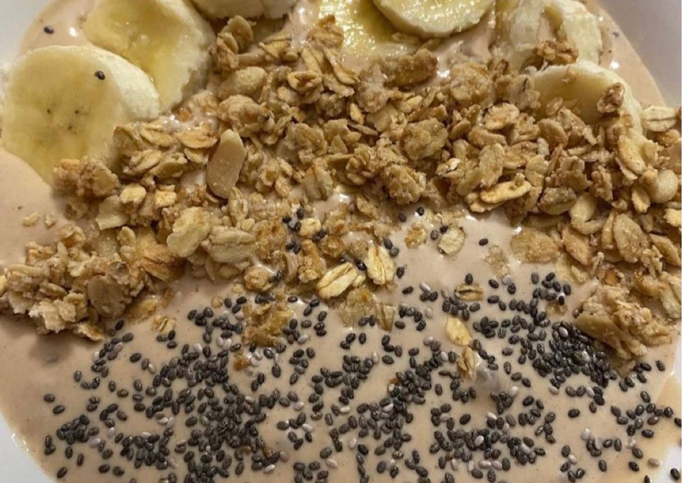 - Top with banana, peanuts, granola, cacao nibs and chia seeds